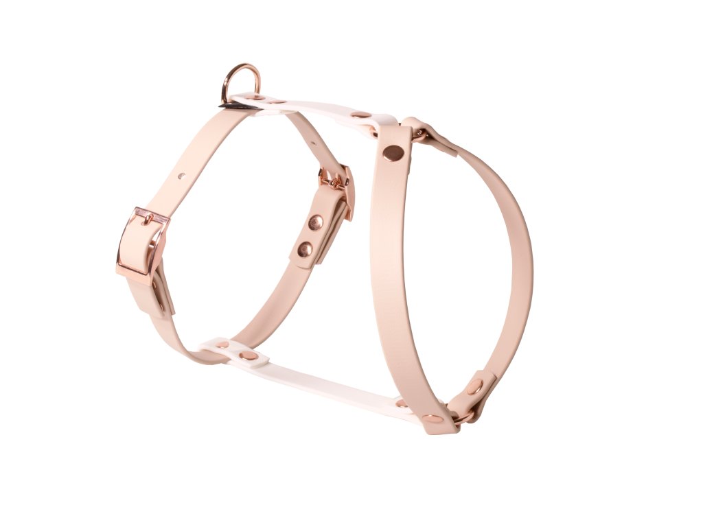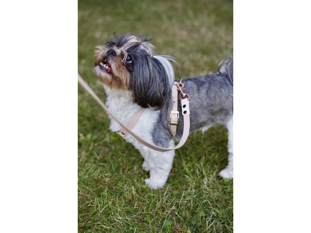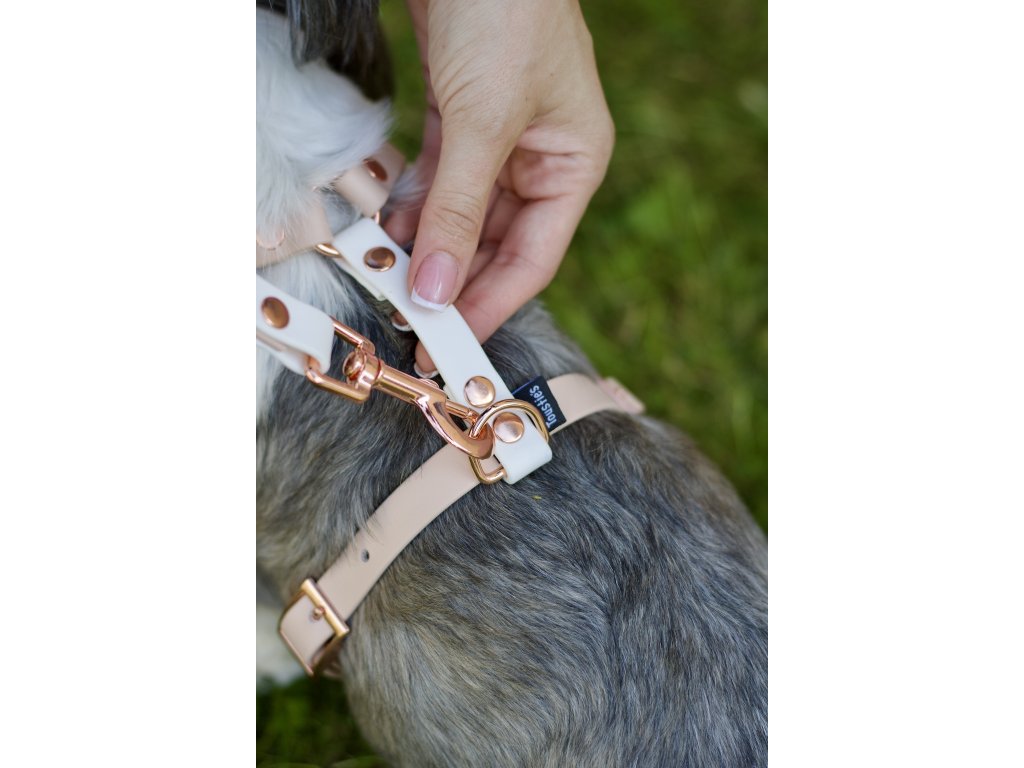Dvoubarevná kombinace béžové a bílé dodává postroji na eleganci a šmrncu, zatímco růžově zlaté kovové komponenty přidávají nádech luxusu. Ať už máte šťěně, středně velkého fešáka nebo pořádného hafana, Kapučíno jim vždy padne jako ulitý.